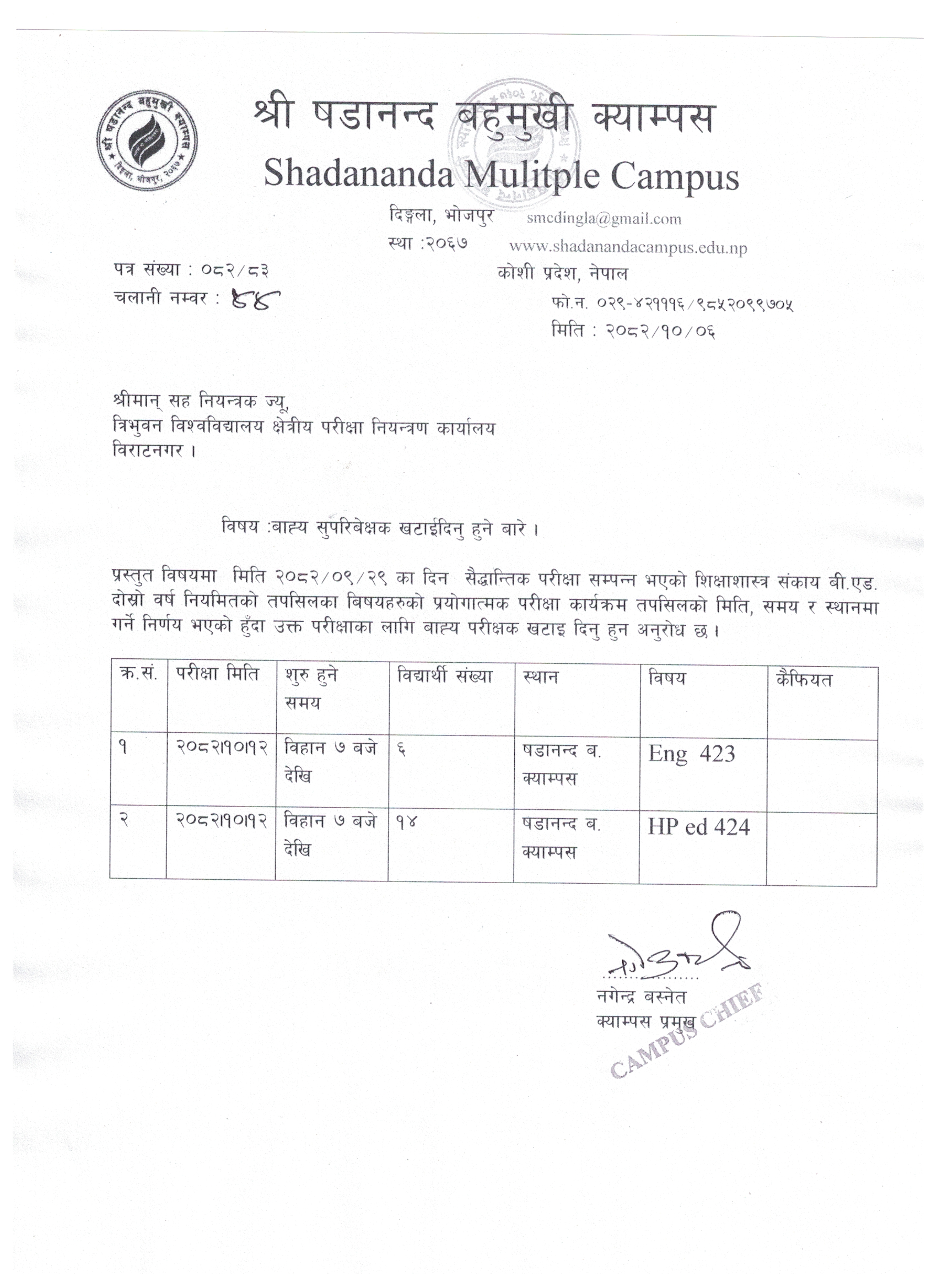 > पठन पाठन स्थकित सम्बन्धमा !     > रिमोट यक्स सेवा सम्बन्धमा !     > वातावरणीय परिवर्तन तथा अनुकुलन सम्बन्धी तालिममा सहभागी भइदिनेबारेको सूचना !     > सेमिनारमा सहभागी भइदिने सुचना !     > प्रयोगात्मक परीक्षा हुने सूचना !     > इन्टर्नशीपमा सहभागी हुने आवेदन सम्बन्धी सूचना !     > रजिष्ट्रेशन फारमको म्याद थप सम्बन्धी सूचना !     > बेसिक कम्पुटर तालिमको अन्तरबार्ता सम्बम्न्धि सूचना !     > इ पुस्तककालय सदस्यताका लागि इमेल लगायतका विवरण उपलब्ध गराउने बार !     > Non Ceidit Course मा भर्ना हुने सम्बन्धमा !     > प्रवेश पत्र वुझिलिने सूचना !     > त्रि वि स्नातक तह तेस्रो वर्ष परीक्षा फारम भर्ने सूचना !     > २०२५ को त्रि वि रजिष्ट्रेसन फारम भर्ने सुचना !     > विएड दोस्रो वर्ष २०८२ परीक्षा समय तालिका !     > पठन पाठन स्थकित सम्बन्धी सूचना !     > विएड विविएस दोस्रो वर्ष आशिक माैका परीक्षा समय तालिका !     > दोस्रो क्याम्पस सभा बस्ने सूचना !     > चार वर्षे स्नातक तह दोस्रो वर्षको नियमिमत मात्रको परीक्षा फारम भर्ने म्याद थप भएको सूचना !     > चार वर्षे वि.एड.र वि.वि.एस. अांशिक मात्रकाे परीक्षा केन्द्र !     > विएड चौथो वर्षको अभिमुखीकरण कार्यक्रम सूचना !     > दोस्रो क्याम्पस सभा हुने सम्बन्धमा !     > विद्यार्थीहरूका लागि अनुसन्धान मुलक लेख रचना प्रकासनका लागि सूचना !     > अनुसन्धान मुलक लेख रचनाका लागि सूचना प्रकासन गरिएको सम्बन्धमा !     > कक्षा संचालन र अभिमुखीकरण कार्यक्रम सम्बन्धी सूचना !     > पहिलो र तेस्रो वर्षको स्वा.शा.विषयको प्रयोगात्मक परीक्षा सम्बन्धमा !     > स्नातक तहमा विद्यार्थी भर्ना सम्वन्धी सूचना !     > स्नातक तह आंशिक दोस्रो वर्ष मौका परीक्षाको परीक्षा समय तालिका !     > चार वर्षे विएड, विविएस कार्यक्रम प्रथम वर्षमा विद्यार्थी भर्नाको सूचना !     > आ.व. २०८२-८३ का लागि सूची दर्ताको सूचना !     > वि.एड.तथा वि.वि.एस. भर्ना समूह २०८१ का सम्पूर्ण विद्यार्थीहरूकाे रजिस्ट्रेशन नम्बर। !     > वि.एड.तथा वि.वि.एस. भर्ना समूह २०८१ का सम्पूर्ण विद्यार्थीहरूकाे रजिस्ट्रेशन नम्बर। !     > अभ्यास शिक्षण तथा अन्य प्रयोगात्मक परीक्षा सम्बन्धी अभिमुखीकरण कार्यक्रमको सूचना विएड बी बी एस दुबै कार्यक्रम !     > चार वर्षे वि.एड. तथा वि.वि.एस. तेस्राे वर्षकाे समय तालिका !     > चार वर्षे वि.एड. तथा वि.वि.एस. तेस्राे वर्षकाे समय तालिका !     > प्रथम वर्ष २०८२ नियमित परीक्षार्थीहरूकाे परीक्षा फारम भर्ने प्रक्रिया !     > २०८२/२/६ गते देखि संञचालन हुने स्नातक तह चौथो वर्षको परीक्षा केन्द्र सम्बन्धी सूचना !     > स्नातक तह विएड विविएस प्रथम वर्षको परीक्षा फारम भर्ने सूचना !     > वि.एड.तथा वि.वि.एस.चाैथाे वर्षकाे प्रवेश पत्र लिने सूचना !     > उभाैली पर्वकाे िवदा सम्